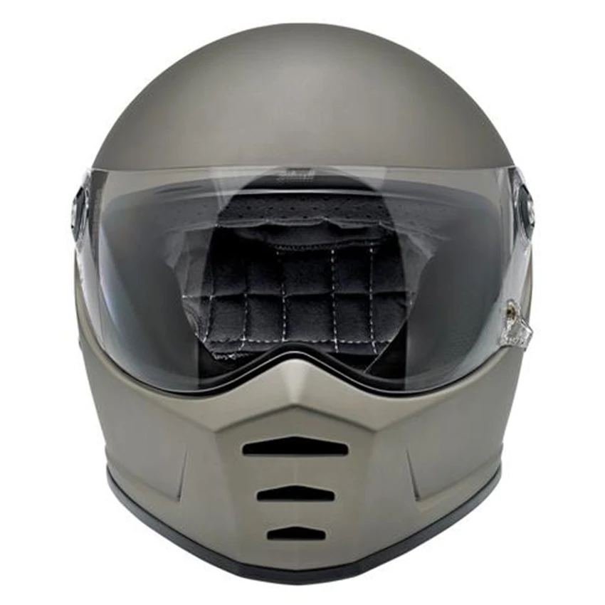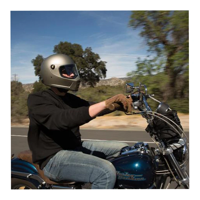 The Lane Splitter is crafted around Biltwell’s proprietary ABS outer shell and features a shock-absorbing EPS liner with hand-stitched interior padding, cheek pads and BioFoam chin bar cushion for comfort. Generous vents in the chin bar get the air flowing and the outlet in back lets hot air escape. The Lane Splitter shield boasts extremely accurate optics and simple hinge mechanics for high style and easy removal for replacement or cleaning. A brass peg and hole configuration on the left side of the shield offers speedy opening and secure closing with little fanfare or complication. Mesh pockets are included in the ear recess–perfect for aftermarket drop in communication systems.