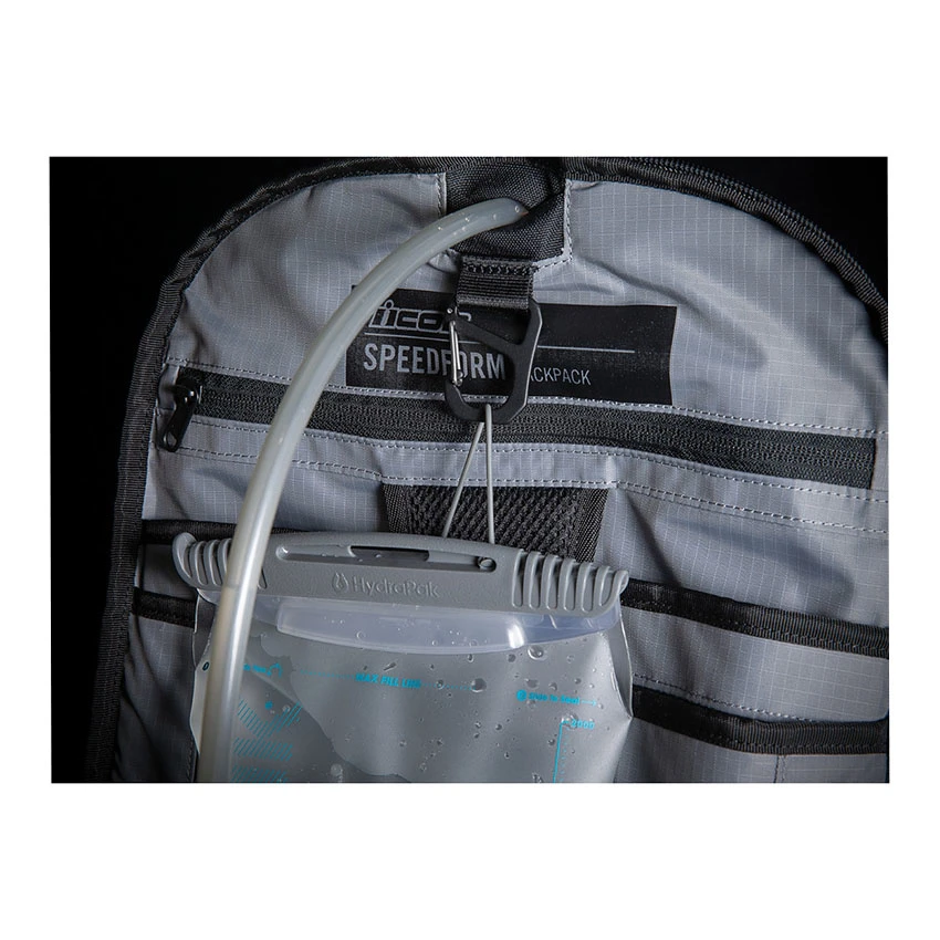 The Speedform backpack features a 20L capacity in the main compartment. Features an integrated speed hump, the hardshell chassis is designed to be aerodynamic at speed to reduce drag. And an integrated helmet cradle system that is easy to deploy, allowing you to walk around hands-free. The quick access exterior pocket is fleece-lined as not to scratch your sunglasses or electronics. Internally, the Speedform is hydration-system compatible and features a padded 15″ laptop compartment. Additionally, the internal pocket is sized to hold our Viper D3O back impact protector.