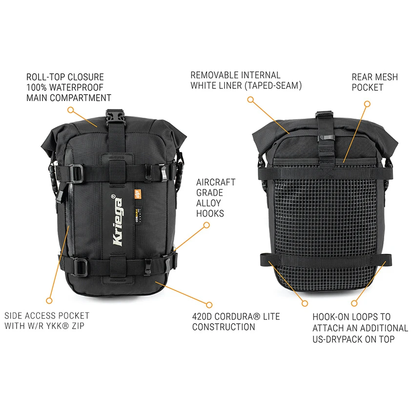 - Hook-on to any Kriega Backpack for additional waterproof storage