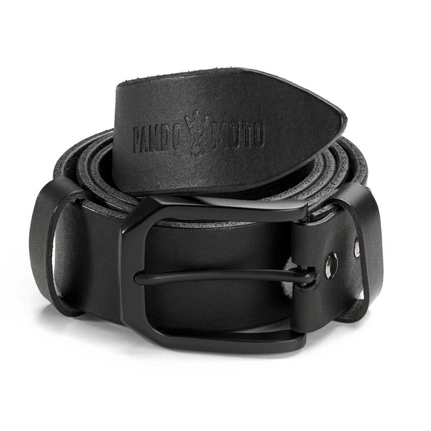 Genuine leather belt made in Greece. Specially designed by PANDO team. Galvanized metal matte black buckle perfectly matches the leather. Hot pressed PANDO MOTO logo at the tip. Easy adjustable length.