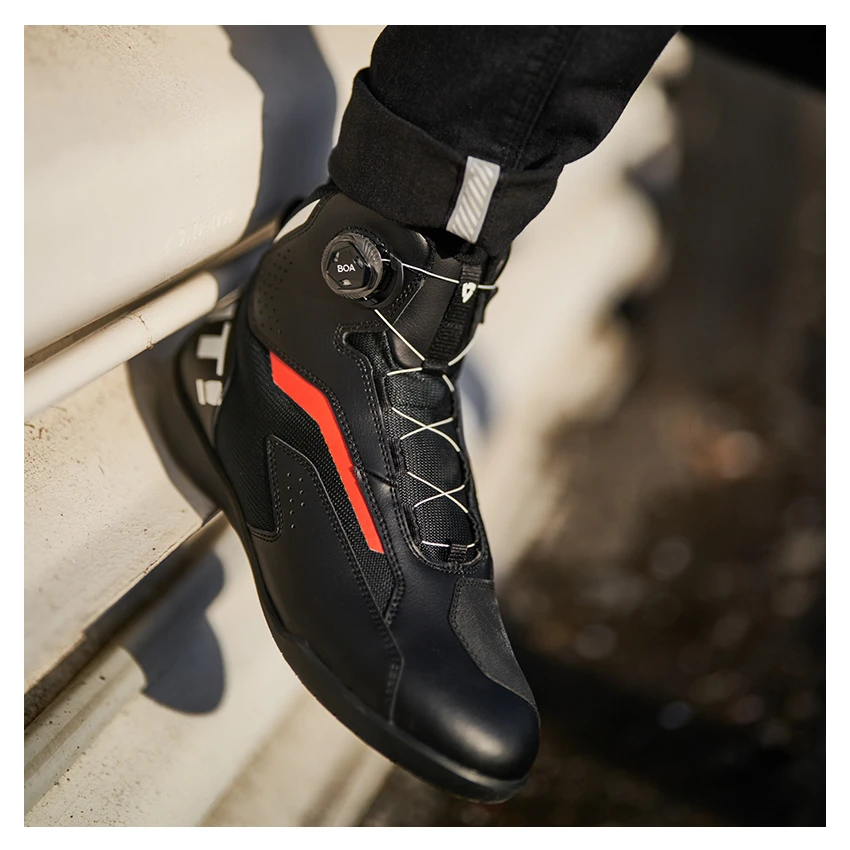 You can trace every panel, stitch, and seam of the all-new Revit Jetspeed Pro shoes back to the track. The racing pedigree is underlined by the shoes’ aerodynamic profile and bold REV’IT! graphics at the heel. To seal the deal, the BOA® Fit System allows micro-adjustment (push in to engage, twist to tighten, and pull up for fast release), for achieving the right fit in moments, even when you’ve got your gloves on.