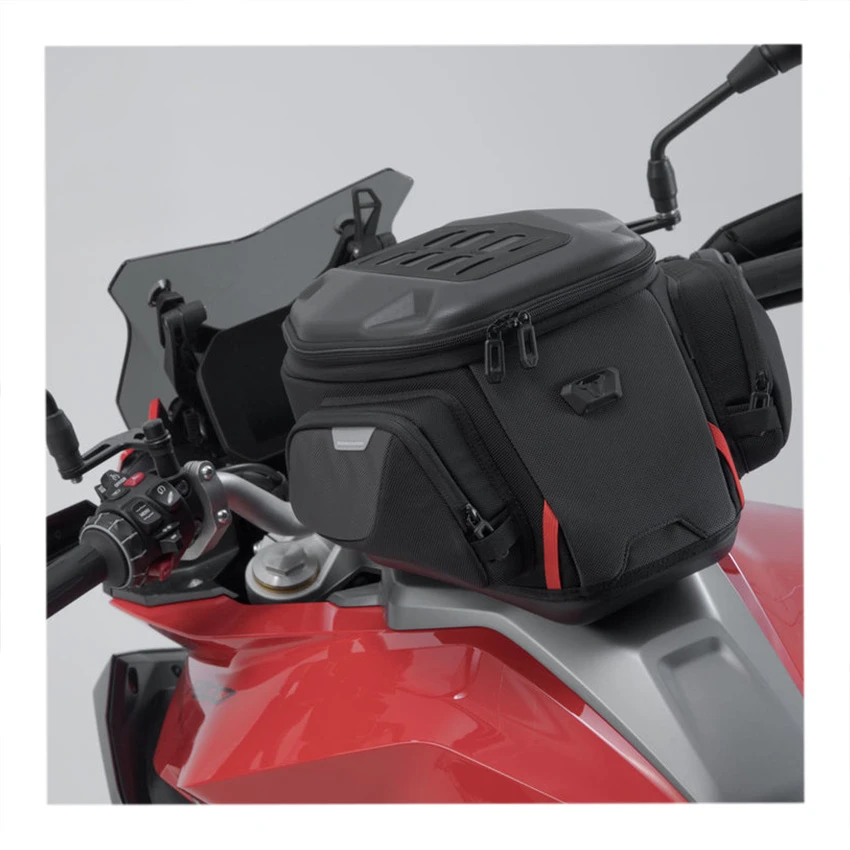 atching this, SW-MOTECH offers the patented PRO tank rings made of fiberglass-reinforced plastic. They are made to match the motorcycle model. The robust PRO tank ring with magnetic guide aid secures the PRO tank bags with a mechanical QUICK-LOCK snap lock. This allows the tank bags to be attached or removed with just one hand.